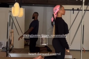 萨瓦娜转发了一位位于洛杉矶的普拉提教练的动态,后者晒出了她指导詹姆斯夫妇练习普拉提的片段。