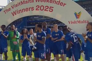 赛后,切尔西队长詹姆斯代表球队领取了季前赛获胜的冠军奖杯。