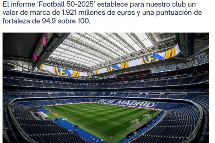根据品牌评估机构Brand Finance发布的《Football 50-2025》年度报告,皇家马德里连续第二年成为全球最具价值足球品牌,并连续第四年保持全球最强足球品牌地位。我俱乐部品牌价值增长14%,创下19.21亿欧元的新纪录。