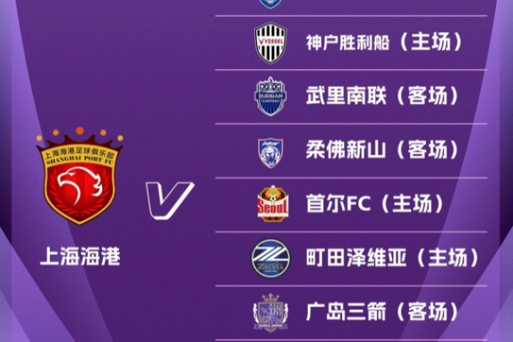 上海海港对阵:主场vs蔚山HD、主场vs神户胜利船、客场vs武里南联、客场vs柔佛新山、主场vs首尔FC、主场vs町田泽维亚、客场vs广岛三箭、客场vs江原FC