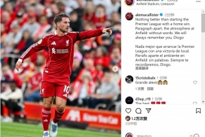 麦卡利斯特赛后在社交媒体上写道:“没有什么比以主场胜利开启英超赛季更棒的了。安菲尔德的氛围无以言表。我们将永远怀念你,迪奥戈(若塔)。”