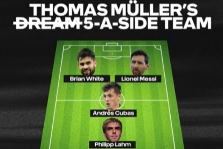 穆勒的五人制阵容:布莱恩-怀特(温哥华白浪)、库巴斯(温哥华白浪)、诺伊尔(拜仁)、拉姆、梅西(迈阿密国际)