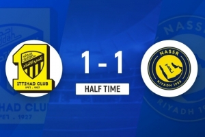 伤停补时5分钟。上半场比赛结束,吉达联合1-1利雅得胜利。