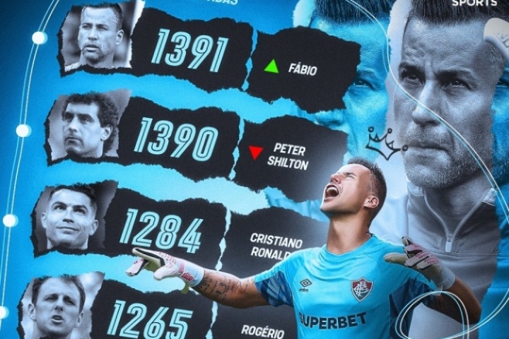 TNT Sports列足坛历史出场数前五,44岁巴西门将法比奥居首,40岁C罗目前落后107场排第三,C罗是榜上唯一一名非门将球员。