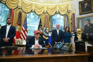 副总统JD-万斯(左一)、国际足联主席詹尼-因凡蒂诺(右二)及国土安全部长克里斯蒂-诺姆(右一)共同见证此次公告。