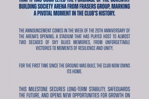 俱乐部公告写道:“考文垂足球俱乐部欣喜宣布,已完成从弗雷泽集团收购考文垂建筑协会竞技场的交易,这标志着俱乐部历史上一个决定性时刻。”