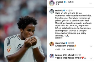 恩德里克社媒写道:一年前,我经历了人生中最特别的时刻之一。 在伯纳乌完成首秀,并打进自己身穿皇马球衣的首粒进球,实现了那个来自巴西塞乌阿苏(戈亚斯州瓦尔帕莱索)的孩子的梦想。 这段故事才刚刚开始,感谢上帝赐予我正在经历的一切祝福。 🤍🙏🏿