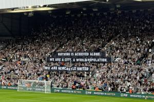 圣詹姆斯公园球场开赛初段,纽卡球迷通过展示横幅营造出充满敌意却又热烈的氛围。横幅上书:“伟业非一人可成,我们是一座城,是全体居民,我们是纽卡斯尔联。”