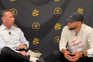 主持人打趣不知道他们能防守谁,库里表示:“我们不需要真的去防守任何人,5V5的话我们肯定需要有人帮我们防守哈哈哈。”