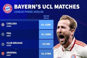 体育资讯8月29日讯 本赛季欧冠联赛阶段对阵抽签结果出炉,德国转会市场盘点了拜仁对手的身价。