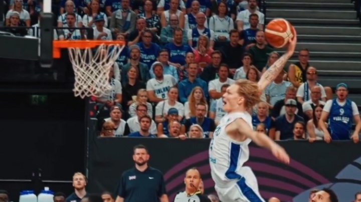 第四节比赛中,芬兰18岁小将米卡-穆里宁贡献一记帅气扣篮——当时穆里宁在防守回合帽掉对手,随后马上快下,接应队友的长传球,腾空来了一个舒展的滑翔单臂暴扣。
