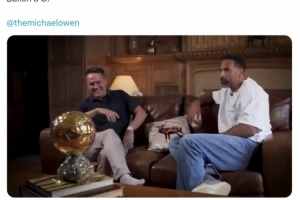 欧文接受费迪南德的采访,并展示自己获得的2001年金球奖杯,费迪南德社媒晒出视频,配文:“金球、金球、金球、金球。”