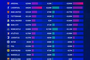 2025大俱乐部夏窗净投入排行(欧)