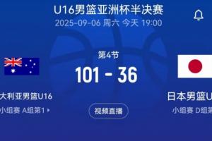 体育资讯09月06日讯 U16男篮亚洲杯半决赛,澳大利亚男篮101-36屠杀日本男篮,晋级决赛。