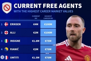 体育资讯9月7日讯 主流联赛的夏窗已经关闭,《转会市场》统计了当前仍为自由身的球员历史身价榜,埃里克森和阿里并列居首。