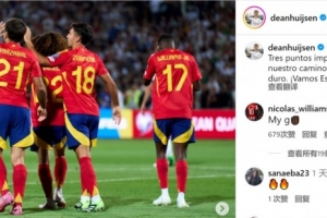 赫伊森社媒晒出比赛照片,配文:“开启世预赛征程的重要三分,让我们继续努力,加油西班牙!”