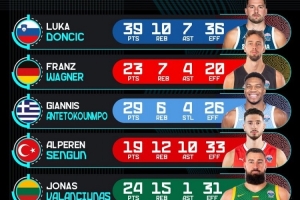 4场对决结束后,欧锦赛官推晒出了8强战中的球员高光表现: