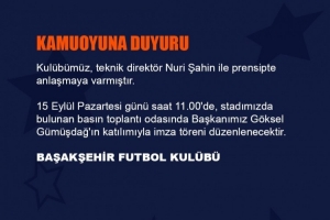 伊斯坦布尔俱乐部已与主教练沙欣原则上达成协议。双方签约仪式将于北京时间9月15日下午4点在俱乐部体育场新闻发布厅举行,俱乐部主席戈克塞尔-古姆什达格将出席签约仪式。