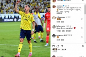 C罗社媒晒出赛后谢场的照片,配文:“我们一起战斗,一起赢!感谢大家的支持,让我们继续赢下去!”
