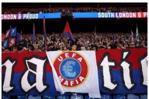 水晶宫球迷展示的横幅将欧足联标志中的欧洲地图替换为欧元符号,并标有“UEFA MAFIA”(欧足联黑手党)字样。
