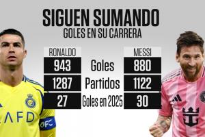 ESPN统计梅罗生涯数据,梅西1122场打进880球,2025年打进30球;C罗1287场打进943球,2025年打进27球。