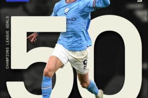 哈兰德也成为第10位达成欧冠50球成就的球员。