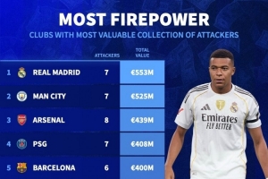 体育资讯9月23日讯 德国转会市场统计了各家俱乐部一线队锋线球员的身价,并列出锋线总价榜单,皇马5.53亿欧居首,曼城、阿森纳二三位。
