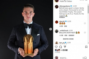 体育资讯9月24日讯 阿森纳前锋约克雷斯更新社媒动态,晒出自己与盖德-穆勒奖杯的合照。