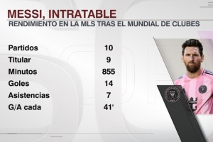 据ESPN的数据统计,在世俱杯后,梅西在10场比赛中已经打进14球,并送出7次助攻。