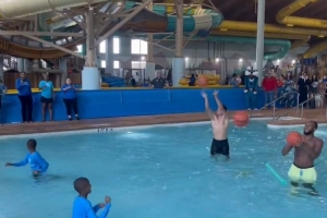 两人在泳池进行投篮PK,为Boys & Girls Club of Greater Houston俱乐部筹集了1万美元的善款。