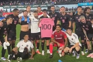 体育资讯9月25日讯 美职联迈阿密国际4-0大胜纽约城,21岁迈阿密后卫阿伦完成球队百场里程碑,赛后他领取百场纪念球衣,全队合影庆祝。