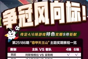 第25186期传足4/6场游戏特色奖期已经于2025年9月24日20:00开售,将于2025年9月28日20:30停售,并于9月29日开奖,其中阿斯顿维拉VS富勒姆、纽卡斯尔联VS阿森纳、罗马VS维罗纳、AC米兰VS那不勒斯为4场进球游戏竞猜赛事。