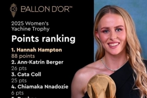 体育资讯9月28日讯 《法国足球》公布了2025年首届女足雅辛奖的投票结果,英格兰国家队兼切尔西门将汉娜-汉普顿以压倒性优势历史性地夺得该奖项。