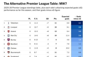 体育资讯10月2日讯 根据The Athletic统计,曼联预期进球12.3个,实际进球7个,是英超实际进球与预期进球相差最大的球队。