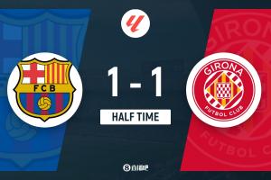上半场补时2分钟,巴萨1-1赫罗纳。