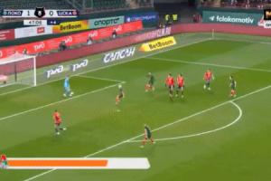 比赛第47分钟,沃罗比耶夫在角球区附近直接起脚吊向远门柱破门,队友见状抱头。