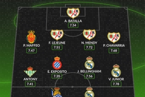 体育资讯11月3日讯 WhoScored评出了西甲10月最佳阵容,姆巴佩、贝林厄姆、维尼修斯、安东尼在列。