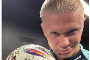 哈兰德社媒晒出队友签名的比赛用球,并配上五指山的表情符号,庆祝打进5球并取胜。