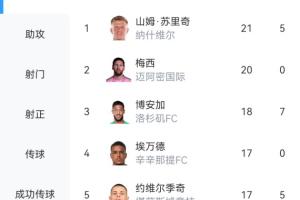 本赛季梅西在美职联出战21场打入20球(0点球),目前暂居射手榜第二位,在射手榜上排名第一的是纳什维尔前锋苏里奇,他出战30场打入21球。