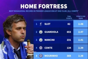 附英超执教单一俱乐部主场场均得分榜(至少25场比赛):
