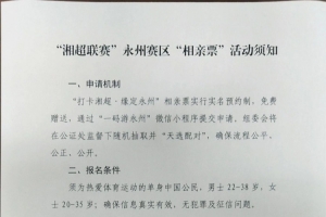 “打卡湘超·缘定永州”相亲票实行实名预约制,免费赠送,通过“一码游永州”微信小程序提交申请,组委会将在公证处监督下随机抽取并“天选配对”,确保流程公平、公正、公开。