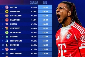 体育资讯10月15日讯 德转更新了德甲身价,以下为更新后德甲各队身价排名: