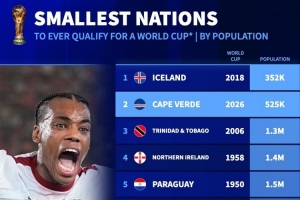 体育资讯10月15日讯 德国转会市场列出了参加世界杯人口最少的国家,冰岛居首,佛得角次席。