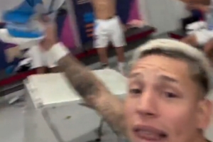 今天,阿根廷U20在世青赛半决赛1-0击败哥伦比亚U20,挺进决赛。赛后,球员们在更衣室疯狂庆祝。