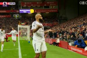 体育资讯10月19日讯 英超第8轮利物浦vs曼联,曼联先进一球,开场仅仅63秒,姆伯莫破门,1-0领先利物浦。