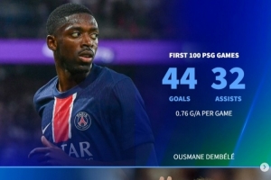 体育资讯10月22日讯 在本轮欧冠巴黎7-2击败勒沃库森的比赛中,登贝莱迎来巴黎生涯100场里程碑,德转也对比了登贝莱与内马尔、伊布、姆巴佩等人在巴黎前100场参与进球数据: