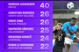 体育资讯10月23日讯 本赛季欧冠联赛阶段已战罢3轮,Squawka统计了到目前为止的解围榜单。帕福斯后卫卢卡森40次解围断崖式领先,圣吉罗斯后卫布尔格斯和布拉格斯拉维亚后卫齐玛26次分列二三位。
