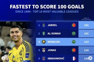 体育资讯10月26日讯 德国转会市场列出了1990年以来为单支球队攻入100球所需最少场次排名,C罗仅用113场就达成利雅得胜利100球里程碑,排名第三位。
