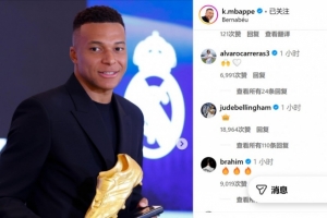 体育资讯11月1日讯 由于上赛季的出色表现,皇马射手姆巴佩夺得职业生涯首个欧洲金靴奖。在社交媒体上,法国人发表了自己的感受,而队友贝林厄姆则和他进行了互动。