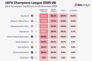 体育资讯11月06日讯 欧冠联赛阶段第4轮的比赛已经全部结束,OPTA超算更新了欧冠夺冠概率。